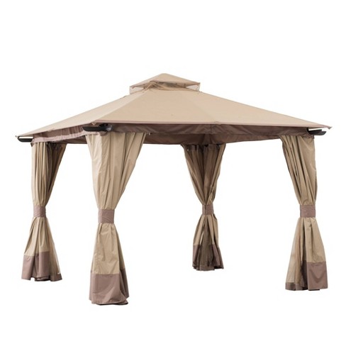 This gazebo features a dark brown water repellant canopy held taut with a black powder coated steel frame.