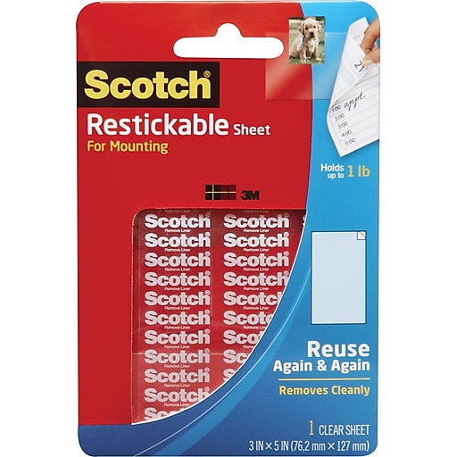 Scotch restickable sheet in clear color has adhesive on both sides for mounting securing objects and measures 3 x 5.